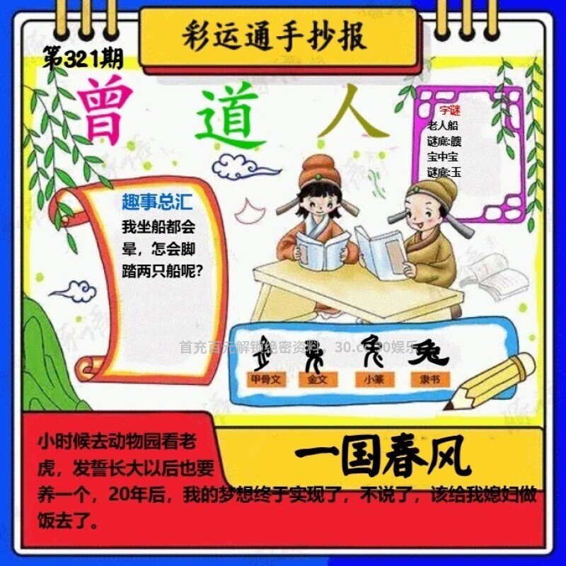 321期:曾道人手抄报 解:我坐船都会晕,怎会脚踏两只船呢? 七肖:猴兔虎狗龙羊蛇 |