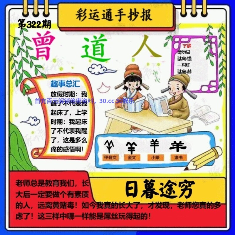 322期:曾道人手抄报 解:放假时期:我醒了不代表我起床了,上学时期:我起床了不代表我醒了,这是多么痛的感悟啊! 七肖:猪马羊狗蛇龙虎 五肖:猪马羊狗蛇 三肖:猪马羊 |